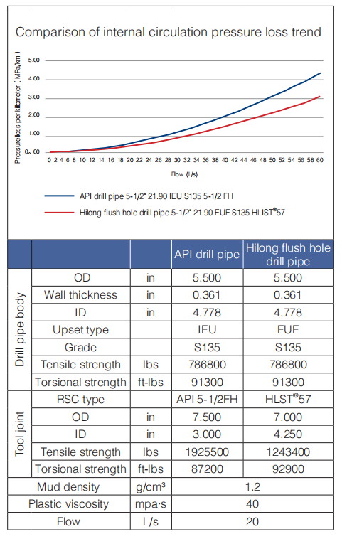 Decreasing the hydro pressure loss to improve the hydro-efficiency is the key to improve drilling speed. Shanghai Hilong's proprietary flush-hole drill pipe is designed to be made-up with the drill pipe body using a special external upset with a large ID and the tool joint with Hilong double shouldered connections with a large ID also. The ID of the upset end and the tool joint are almost the same as that of the drill pipe body.
