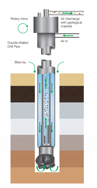 ·Suitable for large hole drilling, improving drilling efficiency.New drilling techniques have been developed on the basis of double-walled drill pipe, the most typical representative of it are RDM (Reel Well Drilling Method) and RCCD (Reverse Circulation Centre Discharge).